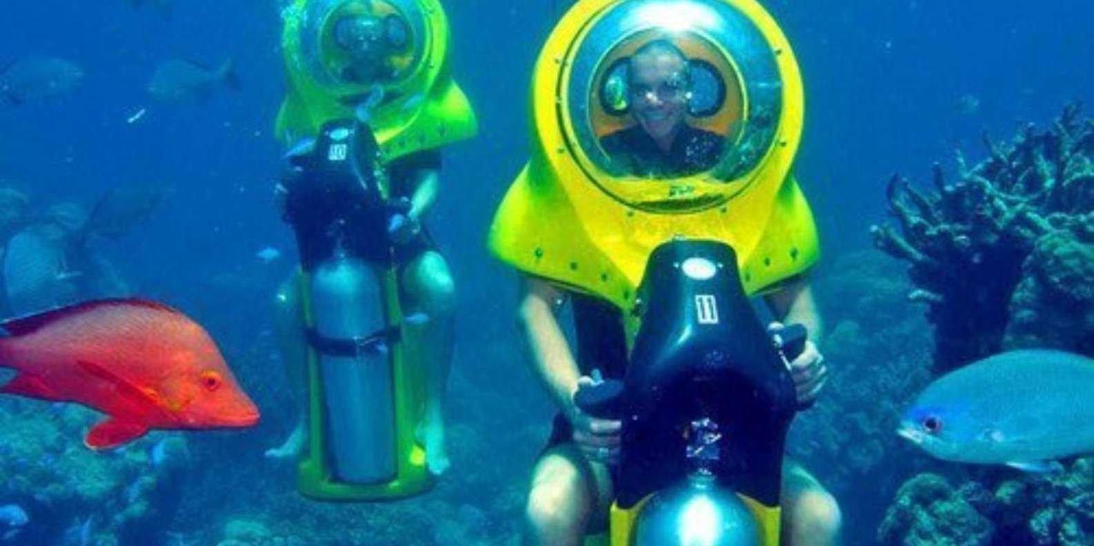 Be picked up from your hotel and head to the beautiful coast of Cabeza de Toro in Punta Cana. Board a boat that will take you to a comfortable platform where you will be received by specialized personnel. With your Dive Master guide, carry out an underwater adventure comfortably seated on an Underwater Scooter without using a mask or tube, and breathe normally at a depth of 3 to 5 meters.