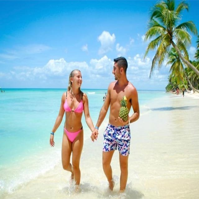 Upon arrival, you will be greeted by white sand beaches and crystal clear waters perfect for swimming and relaxing in the sun. Immerse yourself in the vibrant waters of snorkeling, explore the exotic natural pools filled with starfish, and enjoy a delicious typical Dominican lunch surrounded by palm trees.